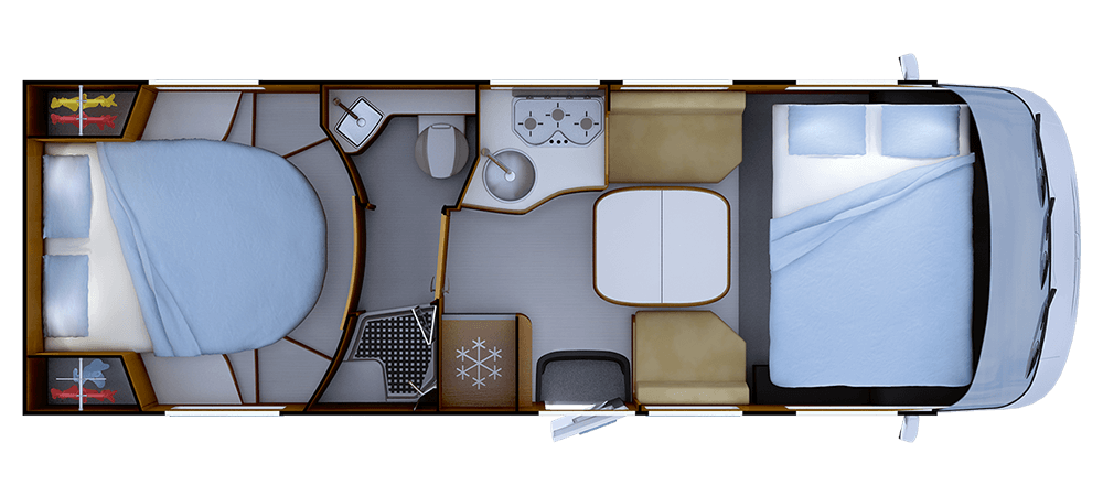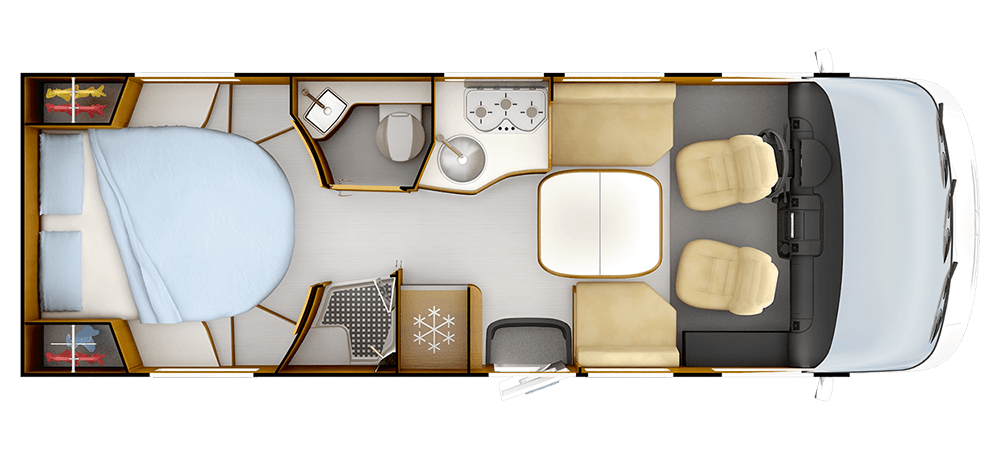 * 2 Bed in cabine optioneel **Aantal plaatsen met gordel, voor de plaatsen volgens kentekenbewijs verwijzen we naar de technische gids. ***Truma Combi 6 CP PLUS