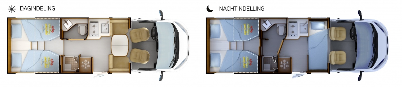 De enige compacte profielcamper met twinbedden, face to face bank en aparte douche
